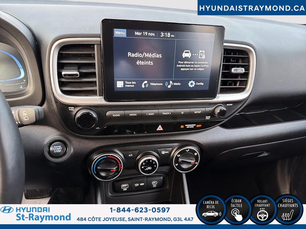 Le Hyundai Venue Preferred IVT 2024 usagé, offert chez Hyundai St-Raymond à St-Raymond, est un VUS compact affichant 31 084 km. Il se distingue par sa couleur extérieure blanche, son intérieur noir, et une transmission automatique jumelée à un moteur 1,6 litre à essence sans plomb. CARACTÉRISTIQUES DU Venue Preferred IVT »» Démarrage par bouton-poussoir »» Démarreur à distance inclus »» Sièges avant chauffants »» Rétroviseurs extérieurs chauffants CARACTÉRISTIQUES DE SÉCURITÉ AVANCÉES »» Avertissement de sortie de voie »» Caméra de recul intégrée »» Coussins gonflables latéraux »» Surveillance des angles morts PERFORMANCE ET EFFICACITÉ »» Moteur 1,6 litre »» Transmission automatique IVT »» Consommation écoénergétique urbaine et routière »» Traction avant CONFORT »» Sièges avant chauffants »» Démarrage par bouton-poussoir »» Rétroviseurs extérieurs chauffants »» Climatisation TECHNOLOGIE ET CONNECTIVITÉ »» Intégration Bluetooth »» Caméra de recul »» Démarreur à distance »» Commandes audio au volant ESPACE DE CHARGEMENT »» Banquette arrière rabattable 60/40 »» Espace modulable pour bagages »» Accès facile à l'aire de chargement »» Quatre portes pour accès pratique APPRÉCIÉ DES AUTRES PROPRIÉTAIRES »» Facilité de stationnement en ville »» Consommation de carburant avantageuse »» Système de sécurité apprécié »» Confort des sièges chauffants GARANTIE Garantie originale du manufacturier: 24 Novembre 2028 ou 100000 Km Le NIV de ce Hyundai Venue Preferred IVT 2024 est le KMHRC8A31RU287856.